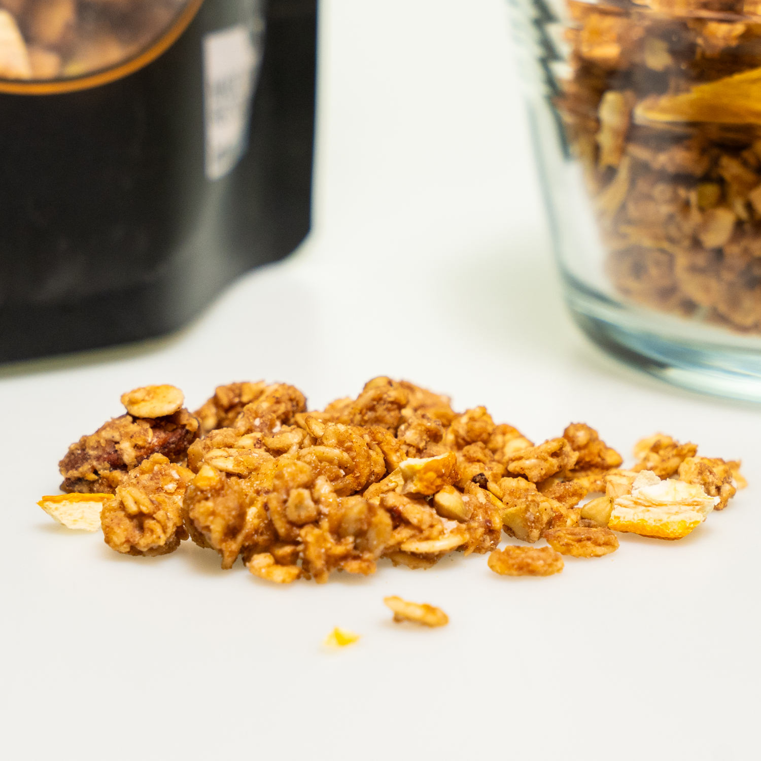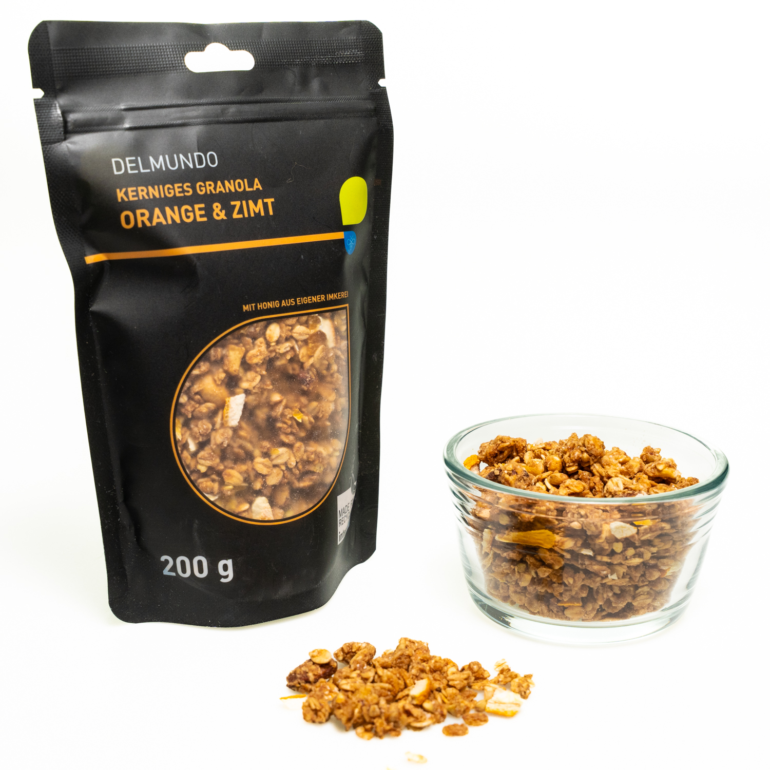 Veredelt wird das Ganze mit Mandeln, Cashewkernen und selbst getrockneten, feinen Orangenstückchen. Mit mildem DELMUNDO-Honig aus der hauseigenen Imkerei gesüßt wird die Mischung goldbraun und knackig gebacken. Abgerundet wird das Ganze mit duftendem Zimt. Perfekt zu Joghurt, Obst oder einfach pur als knuspriger Snack.